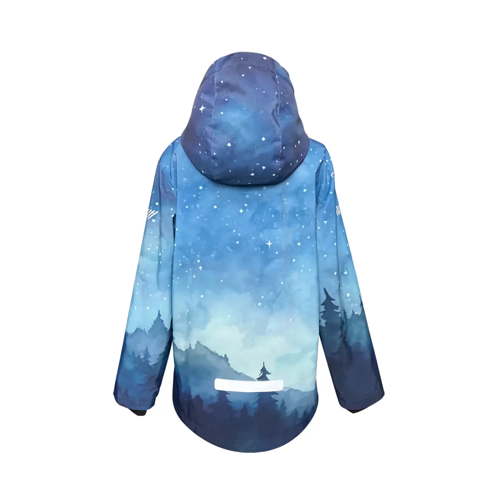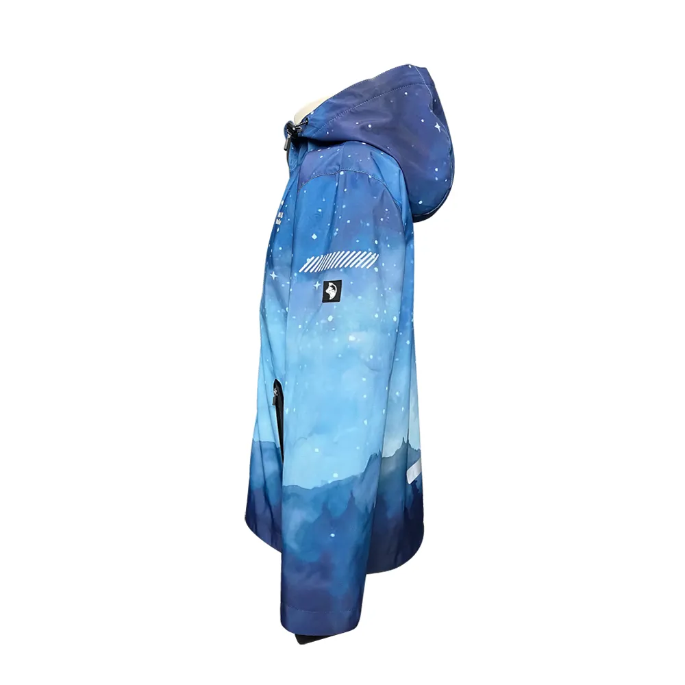 Title: Cosmic Explorer Jacket for Kids: Detachable Fleece-Lined Softshell Description: Inspire wonder with our all-in-one kids‘ softshell system, featuring a stunning all-over galaxy or starry night print. The durable outer shell protects against wind and light rain, while the snug, non-detachable fleece lining ensures warmth. Designed for dreamers and adventurers, it includes secure taped zip pockets, an adjustable hood for added protection, and elasticated knit cuffs to seal out the cold. Perfect for sparking imagination day or night.