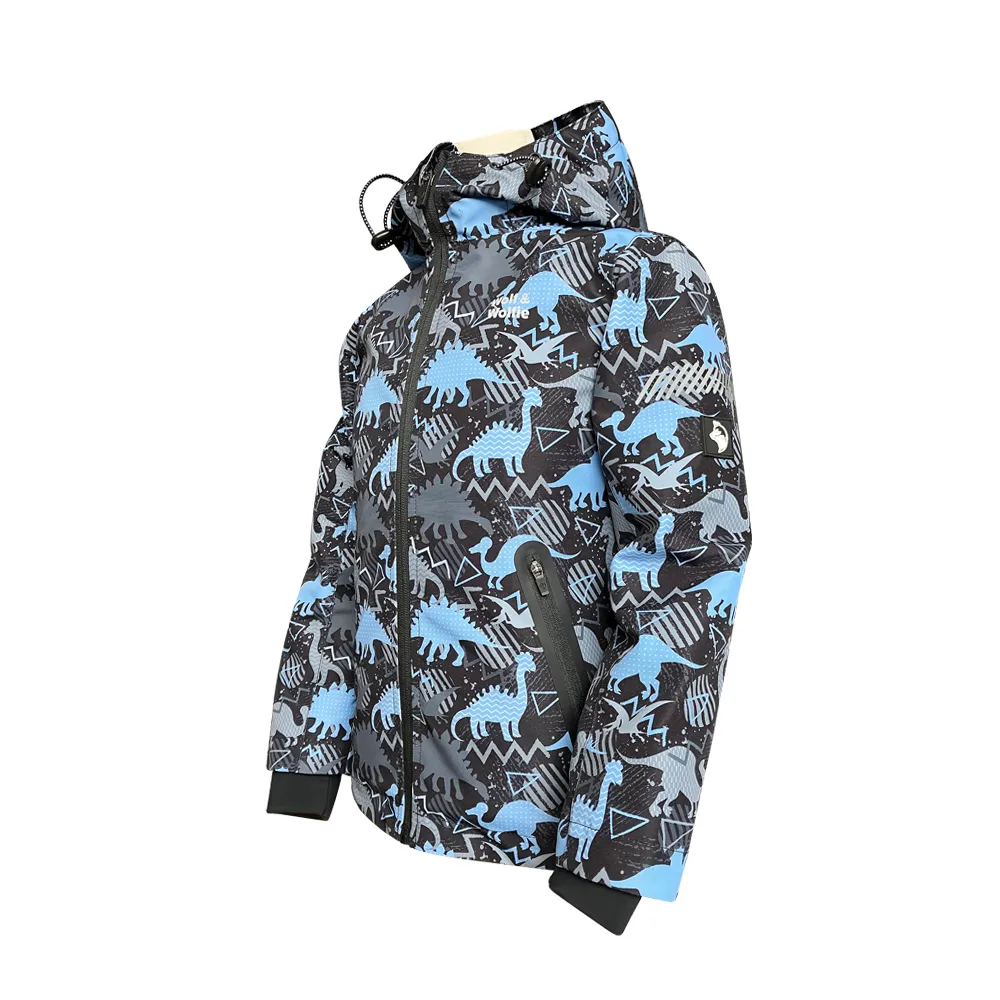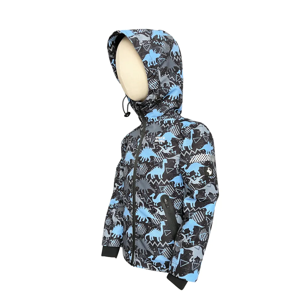 Full Dinosaur Print: Bold, colorful dinosaur graphics cover the jacket for playful style.