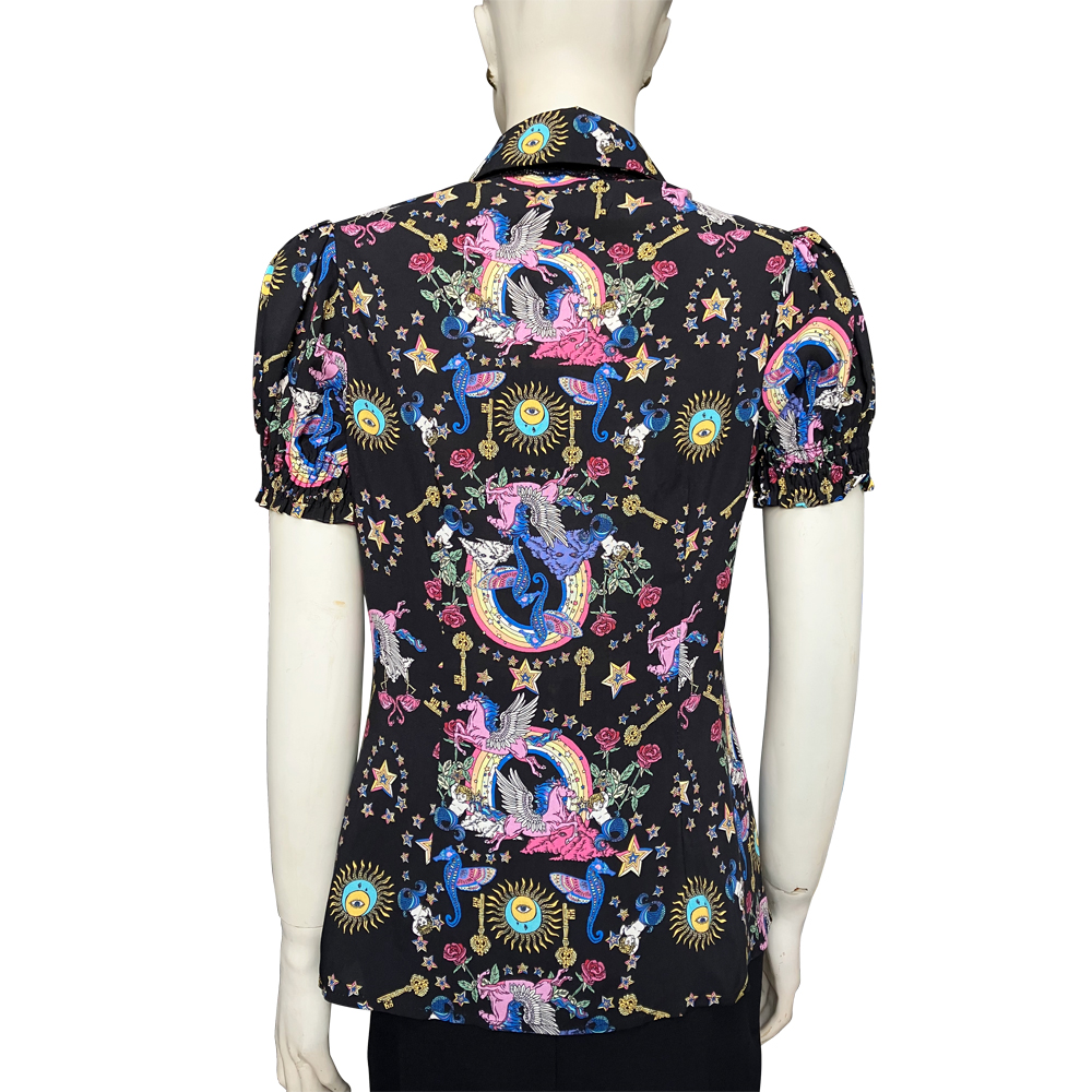 Another charming detail on this shirt is the white button at the center front. Not only do these buttons add a touch of contrast to the floral print, but they also serve as a beautiful decorative element. The buttons add a touch of vintage charm to the shirt, making it a timeless piece in your wardrobe.
